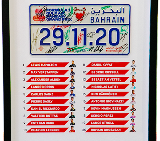 وسيتمكن من قام بشراء تذاكر سباق جائزة البحرين الكبرى من الدخول في سحب وفرصة الفوز بلوحة أرقام مميزة تجمع 20 توقيع من تواقيع سائقي الفورمولا وان لسباق جائزة البحرين الكبرى لطيران الخليج لموسم 2020، وسيتمكن جميع من قاموا بشراء تذاكرهم بدخول السحب تلقائيا وذلك حتى يوم الجمعة الموافق 26 مارس الجاري عند الساعة 12 مساء، وسيتم اختيار الفائز عشوائيا.