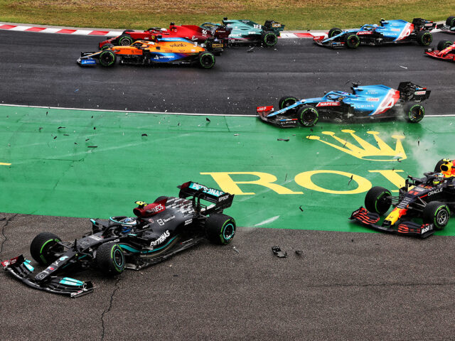 بعد تهاطل الأمطار قبل الانطلاقة اختار جميع الفرق بدء السباق بإطارات وسط، لكن السائق أنطونيو جيوفانزي جازف باختيار الإطارات الميديم وذلك مع نهاية لفة التحمية، وعند الانطلاقة حدثت المنافسة عند المنعطف الأول، فأصطدم فالتاري بوتاس بسيارة لاندو نوريس الذي تجاوزه ودفعه نحو فيرستابين، وكذلك أصطدم بوتاس بسيارة سيرجيو بيريز، وكذلك لانس سترول خرج عن المضمار واصطدم بسيارة تشارلز لوكلير ودفعها باتجاه دانيال ريكاردو، وأدى ذلك لانسحاب كل من بيريز، بوتاس، لوكلير وسترول من السباق.