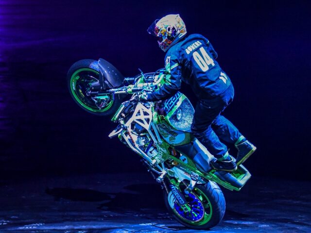 عرض الدراجات النارية، حيث تم تأسيس فريق ستنت شو الدولي في العام 2000 ليجول بعروضه مختلف أنحاء العالم وقام بأداء مثير لا يصدق لاستقطاب الجماهير من جميع الأعمار. بدأ قائد الفريق مارك مسيرته المهنية عام 1984 وهو في سن الرابعة عشرة، وهو الآن يتمتع بخبرة تزيد عن 30 عامًا متخصصًا في السيارات والدراجات النارية وعروض السقوط العالي، ويؤدي بعضًا من أكثر الأعمال إثارة على الإطلاق في السينما والتلفزيون. وسبق لفريق فريق ستنت شو الدولي بتحطيم الأرقام القياسية العالمية في عدد من العروض الذي قام بها في مختلف أنحاء أوروبا والشرق الأوسط. أصبح آرون، الذي عرف بأداؤه في العديد من البرامج التلفزيونية، نجمًا رائعًا في حد ذاته وأصبح أيضًا صاحب الرقم القياسي في موسوعة غينيس العالمية.
