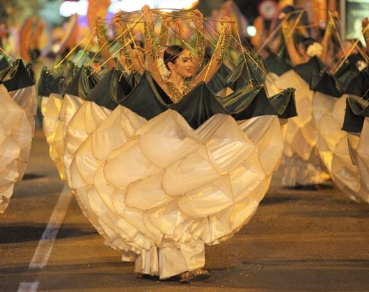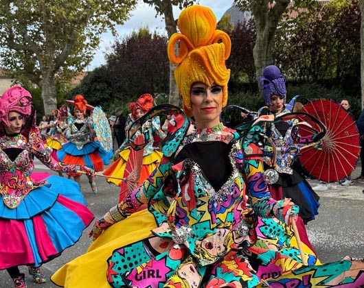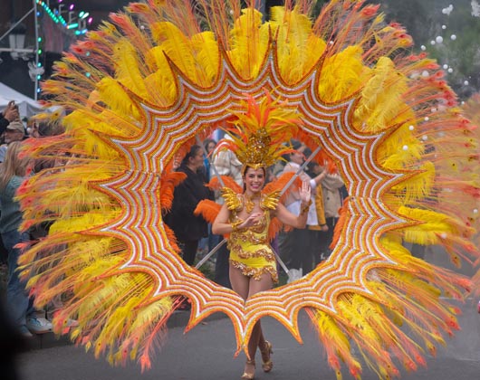 A radiant roaming spectacle featuring dazzling golden costumes and a magnificent sun-shaped feather display that lights up any event with warmth, colour, and vibrant carnival energy.